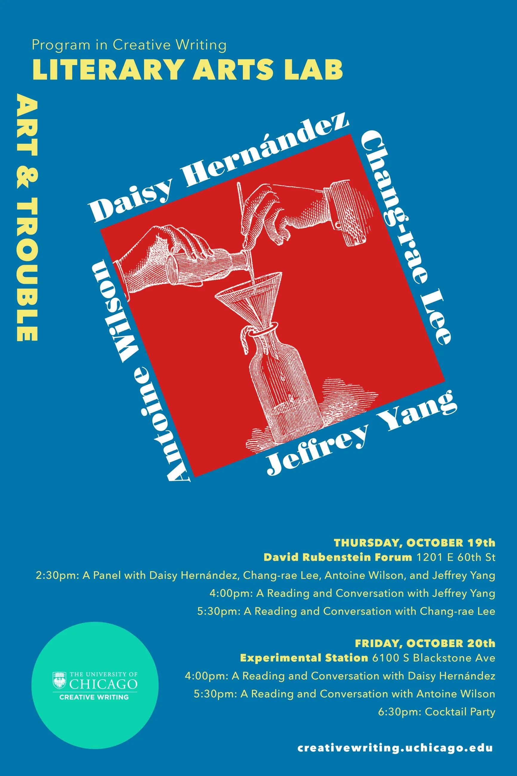Literary Arts Lab: Art & Trouble with Antoine Wilson Friday, October 20, 2023 5:30 PM 8:00 PM Experimental Station 6100 South Blackstone Avenue Chicago, IL, 60637 United States (map) Google Calendar ICS RSVP here.
