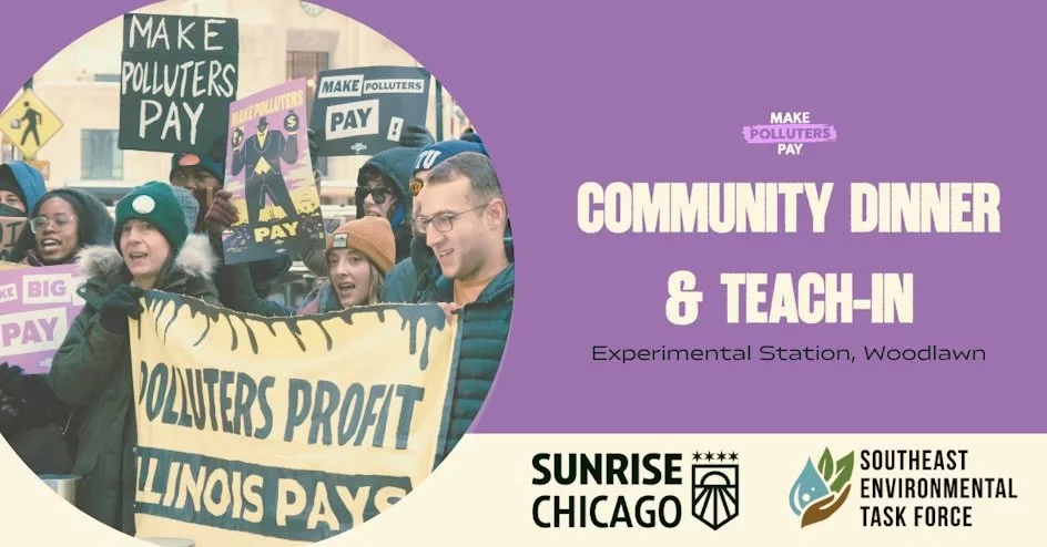 Join your neighbors, community members, and climate justice advocates for an evening of shared food, learning, and conversation around climate superfund advocacy in Illinois and demanding that our biggest polluters pay for the damage they cause to our communities. This event is co-hosted by Sunrise Chicago and the Southeast Environmental Task Force and open to all members of the community. Food will be provided.