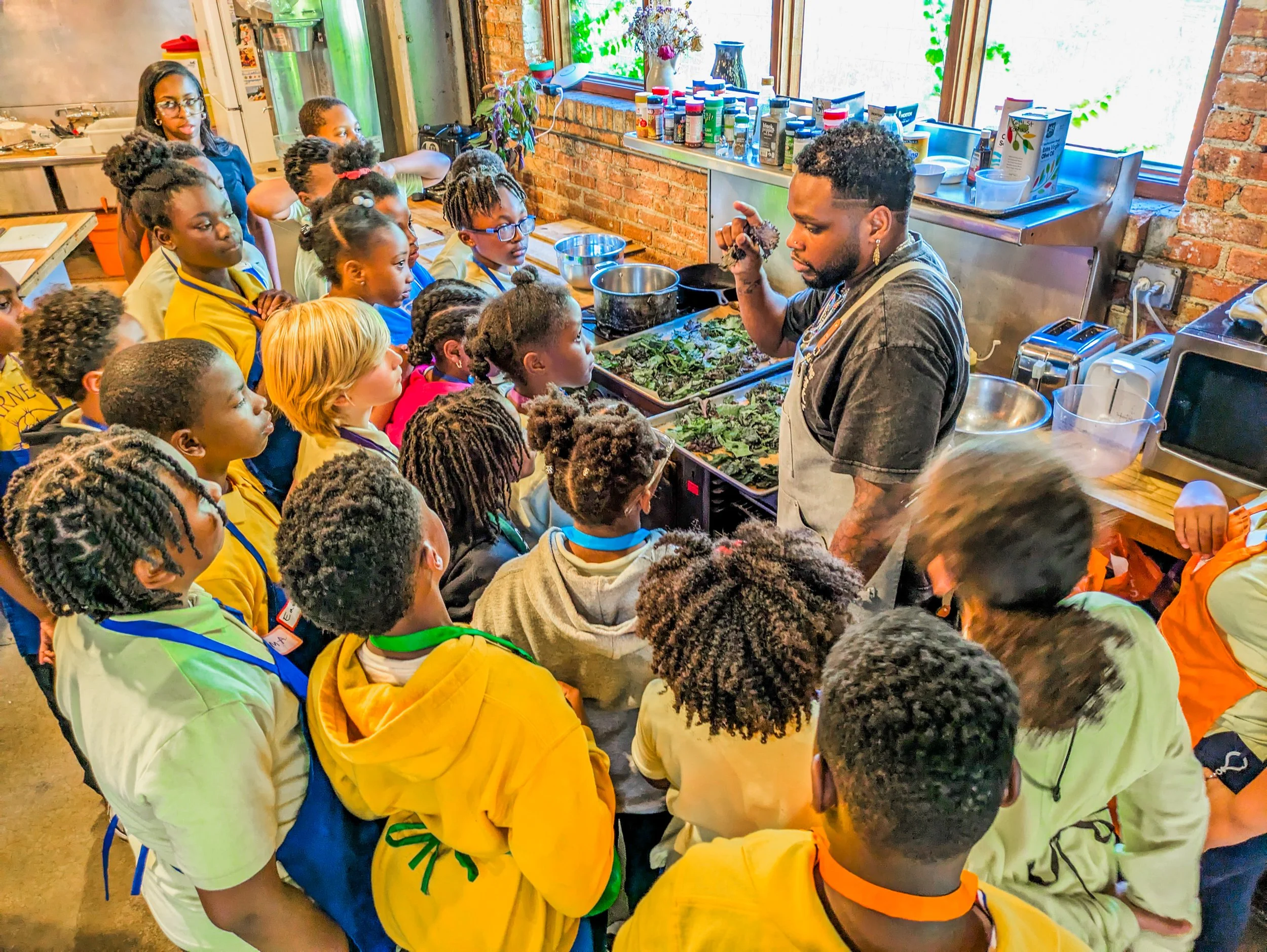 Students take part in after-school cooking classes, held at Experimental Station, focused on local, healthy foods. Participants are given nutritional information on the dishes prepared, along with recipes so that they can be easily recreated at home.