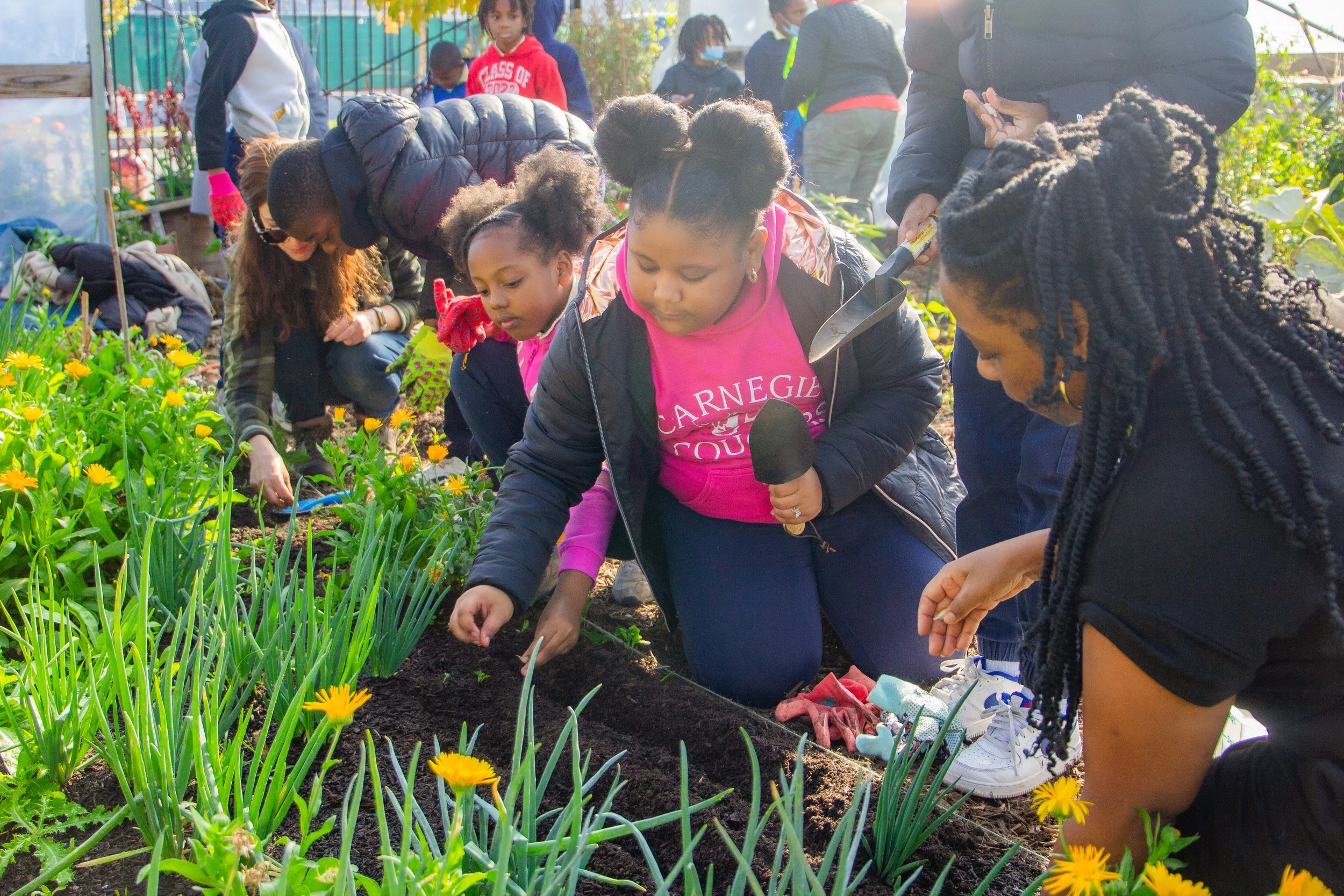 Students participate in 10 weeks of gardening classes, taking place in the fall and spring. Students learn to produce a food crop through planting, growing, and harvesting at our nearby hoop house at Jackson Park Terrace apartments.